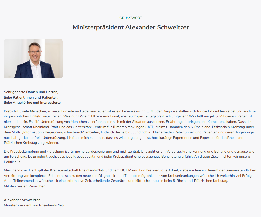 Unter dem Motto „Information - Begegnung - Austausch“ veranstalteten die Krebsgesellschaft Rheinland-Pfalz e. V. und das Universitäre Centrum für Tumorerkrankungen der Universitätsmedizin Mainz (UCT Mainz) gemeinsam den 6. Rheinland-Pfälzischen Krebstag, einen Tag für an Krebs erkrankte Menschen und deren Angehörige, sowie für alle Interessierten.